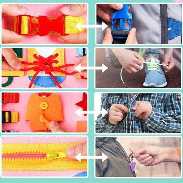 Cada elemento da placa foi pensado para exercitar habilidades cognitivas e motoras como abrir fechos, abotoar, amarrar cadarços, girar engrenagens e manipular zíperes.